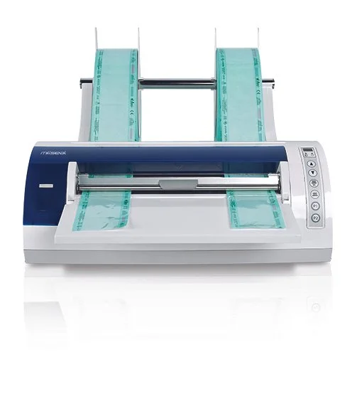 Automaattinen lämpösaumaaja Mocomilta erityisen korkealla saumalla. Voit ohjelmoida laitteen leikkaamaan pusseja valmiiksi jopa 20 pussin minuuttitahdilla.